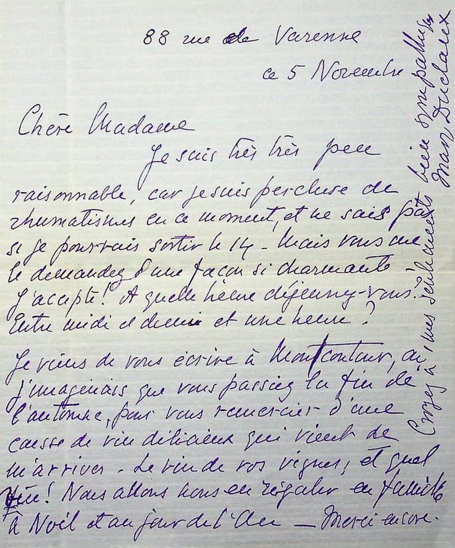 Agnes Mary Frances Robinson dit Mary Duclaux (1857-1944), poétesse, écrivain, traductrice. L.A.S., 8 novembre 1922, 1p in-4. A la philanthrope Alice de Koenigswarter (1878-1963), épouse du compositeur Fernand Halphen. Jolie lettre amicale pour accepter une invitation. Elle la remercie aussi pour une caisse de vin. Peu commun. [418]