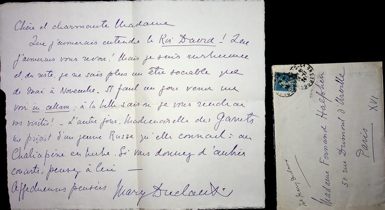 Agnes Mary Frances Robinson dit Mary Duclaux (1857-1944), poétesse, écrivain, traductrice. L.A.S. + enveloppe, 24 novembre 1924, 1p in-4. A la philanthrope Alice de Koenigswarter (1878-1963), épouse du compositeur Fernand Halphen. Elle refuse une invitation pour entendre Le Roi David (d'Arthur Honegger) étant enrhumée. Mademoiselle des Garrets lui a parlé d'un jeune russe, « un Chaliapine en herbe. Si vous donnez d'autres concerts, pensez à lui ». Peu commun. [418]