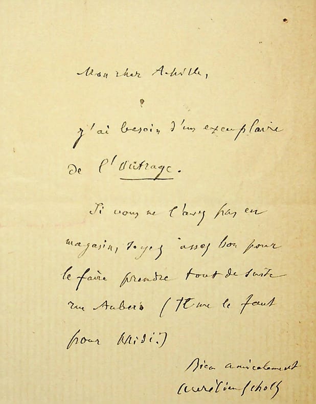 Aurélien Scholl (1833-1902), écrivain, journaliste. L.A.S., sd [1885?], 1p in-12. A un ami, probablement libraire. Il a besoin d'un ouvrage, L'outrage, et lui demande de lui procurer pour midi. Peut-être est-ce le livre de Mme Carette publié en 1885. [418]