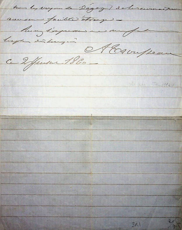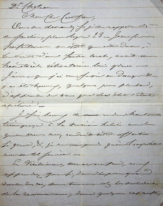 Armand Trousseau (1801-1867), médecin, clinicien, homme politique, député. L.A.S., 2 juillet 1860, 1p 1/4 in-4. Au Docteur Chateau. « mon cher confrère, vous me demandez si je me rappelle de Mme de Saucheri (?), place Royale 23. Je me souviens parfaitement en effet que cette dame, à la suite d'une fausse couche, avait une hématocèle retro-utérine bien grave. J'avoue que j'ai cru sa vie en danger & j'ai été heureux, quelques jours plus tard, d'apprendre de vous que son état s'était amélioré. Je suis heureux de rendre [mot illisible] témoignage à la manière habile avec laquelle vous avez réduit cette affection si grave, & je ne comprends guère [mot illisible] avec un tel service. En vieillissant, mon cher confrère, vous apprendrez que si, dans le plus grand nombre de cas, nous trouvons chez les malades, de la reconnaissance, dans quelques cas aussi nous les voyons se dégager de la reconnaissance avec une facilité étrange. Recevez l'expression de mes [mot illisible] distinguées. A Trousseau ». Autographe peu commun de cet important médecin. [418]