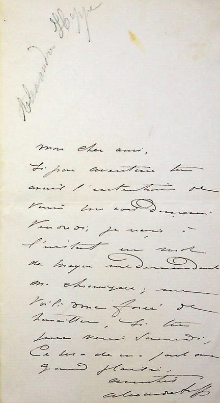 Alexandre Hepp (1857-1924), écrivain, journaliste, disciple d'Emile Zola. L.A.S., sd, 1p in-12. Il demande à son correspondant de ne pas venir le lendemain vendredi mais le samedi car Arthur Meyer lui a demandé une chronique. [418]