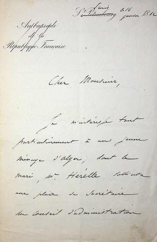 Alfred Chanzy (1823-1883), général, gouverneur de l'Algérie, ambassadeur en Russie, député, sénateur. L.S., Paris, 16 janvier 1882, 3p in-8. Lettre de recommandation pour un jeune ménage dont le mari, Sébastien Hérelle (1851-?), gendre d'Alexandre Bellemare (?-1885) - un conseille de gouvernement -, souhaite une place en Algérie. [418]