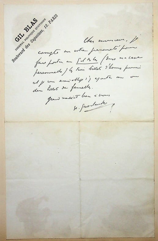 Lettre autographe signée adressée à Georges Feydeau à qui le célèbre illustrateur fait parvenir une pièce par lui écrite intitulée Le Châtelain à la petite semaine. * Membre du SLAM et de la LILA / ILAB Member. La librairie est ouverte du lundi au vendredi de 14h à 19h. Merci de nous prévenir avant de passer,certains de nos livres étant entreposés dans une réserve.