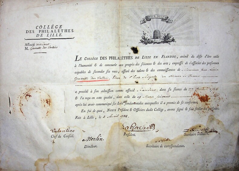[Franc-Maçonnerie, Lille] Diplôme du Collège des Philalèthes de Lille, collège maçonnique fondé par deux loges lilloises du Grand Orient, "La Modeste" et "Les Amis réunis", en 1785 et disparu en 1789. P.S., Lille, 2 avril 1788, 1p in-folio oblong. Superbe document sur parchemin avec entête gravé représentant une ruche, document imprimé à trous concernant l'admission d'un « associé résident », ici pour un élève de l'école royale des mines de France (actuelle école des Mines de Paris), Jean-Louis Gravelle des Vallées (1772-1844), issu d'une famille normande exilées aux Pays-Bas. Le document est signé par cinq membres : Philippe-Liborio Valentino (1744-1821), chef du conseil ; Merlin, directeur (et militaire) ; Barthélémy-François-Joseph Lagache (1736-?), président ; Joseph-Jean Lagarde (1755-1839), secrétaire ordinaire (et magistrat, député aux Etats-Généraux) ; Deville, secrétaire de correspondance. Ce document est intéressant car ce collège maçonnique ne dura pas longtemps. Les témoignages en sont donc rares. Plié en quatre, sans le timbre scellant le document. Très rare document autour de cette loge/collège qui n'exista que quatre ans. [107]