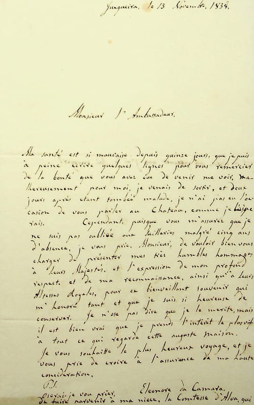 Eléonore Leonor da Câmara (1781-1850), aristocrate, dame d'honneur et préceptrice de la reine Marie II du Portugal. L.A.S., Junqueira (Portugal), 13 novembre 1838, 1p in-8. Sympathique lettre amicale à un ambassadeur. Remerciements, elle a été malade, demande de présenter ses hommages « à leurs majestés royales » (de France ?). Belle lettre, peu commun. [419]