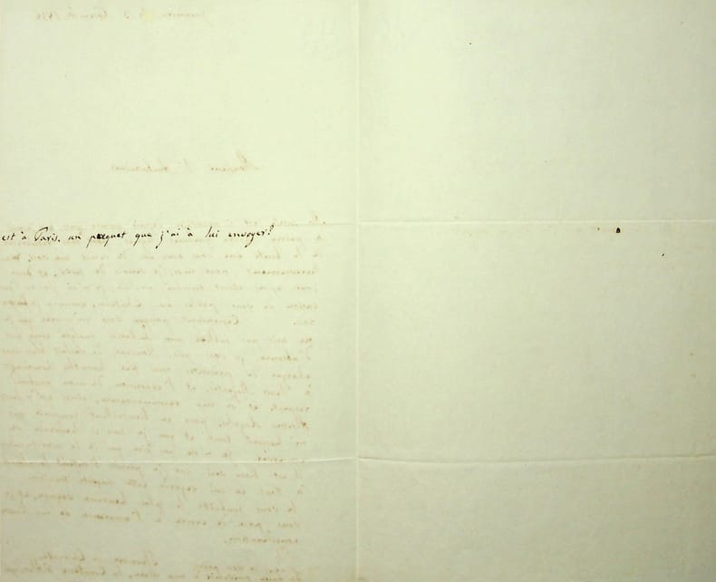 Lettre autographe signée de 4 pages datée du 12 novembre 1851. 124 lignes à l'encre noire. Le manuscrit est présentésous une chemise en demi maroquin vert sapin, plats de papier vert marbré portant une pièce de maroquin avec lamention "Lettre autographe" incrustée sur le premier plat, contreplats doublés d'agneau vert,étui bordé du même maroquin, ensemble signé Goy & Vilaine. Lettre autographe inédite sur le progrès, signée de Pierre-Joseph-Marie Proudhon, figure incontournable de la pensée sociale française, et «père de l'anarchie» selon le président de la République française Armand Fallières. Le philosophe emprisonné depuis 1849 développe dans un style virulent et combatif ses convictions socialistes et condamne les absolutismes de son temps. Extraordinaire profession de foi philosophique, politique et sociale d'un penseur à la marge, dont la fortune critique et l'influence se retrouvent de Karl Marx à Émile Durkheim en passant par Benjamin Tucker. La missive est rédigée d'une écriture rapide et dense, comportant de nombreux passages soulignés appuyant certains concepts philosophiques. Le premier feuillet présente un en-tête du journal Le Peuple de 1850, un des quatre journaux dirigés par Proudhon sous la seconde République, qui lui valurent d'être emprisonné pour «incitation à la haine du gouvernement» «provocation à la guerre civile» et «attaque à la Constitution et à la propriété». Cette lettre inédite, datée du 12 novembre 1851, constitue une réflexion passionnée et inédite, proche d'une lettre intitulée «De l'Idée de Progrès», écrite une dizaine de jours plus tard, que Proudhon publie avec une autre («De la Certitude et de son criterium») dans l'ouvrage Philosophie du progrès. Cet ensemble de textes fut composé seulement deux semaines avant la prise de pouvoir définitive de Louis-Napoléon Bonaparte, à laquelle il s'opposa immédiatement. Une fois sorti de prison en 1852, Proudhon publia les deux lettres chez Lebègue à Bruxelles afin d'échapper à la censure, qui avait interdit la vente de l'opuscule sur le territoire français. Déjà détenu depuis deux ans dans les geôles du futur empereur des Français, Proudhon écrit depuis la prison de Sainte-Pélagie à Romain Cornut, journaliste de La Presse, qui venait de terminer une série d'articles sur le positivisme d'Auguste Comte (Etudes critiques sur le socialisme, octobre-novembre 1851). Il faut voir cette lettre comme un admirable plaidoyer de quatre pages, ou plutôt une confession de sa vision socialiste du progrès, un «positivisme social» qui se fonde sur la remise en cause de l'ordre ancien: «on recule devant une négation intellectuelle, qui est la condition sine qua non du progrès ultérieur». Proudhon tente dans cette lettre de convaincre son destinataire du bien-fondé de ses convictions, et n'hésite pas à user de flatteries qui contrastent étrangement avec sa verve habituelle («Ce n'est pas croyez-le bien, [..] que je désire le moins du monde influencer votre opinion, quelque désir que j'aie de faire la conquête d'un esprit aussi judicieux que le vôtre»). Il établit au fil de la lettre un équilibre entre son âme de polémiste et son désir de légitimité, aspirant à être reconnu par ses pairs non plus comme un simple agitateur mais comme un véritable penseur. On se souvient en effet de ses célèbres traits d'esprit («la propriété c'est du vol?!»), ses sympathies pour les soulèvements de 1848 ainsi que ses pamphlets au vitriol dans Le Peuple qui avaient consacré sa réputation de radical: «J'ai été, jusqu'à ce jour, si sottement jugé, même par les socialistes [...] Parce que j'ai conduit la critique des vieux principes aussi loin qu'elle pouvait aller [...] je n'apparais encore à beaucoup de gens comme la négation pure et simple de tout ce qui est». Proudhon affirme cependant son intention de quitter les remparts de la critique («laissant pour le moment la polémique de circonstance, dans mes nouvelles études») et annonce ainsi à demi-mots l'écritur