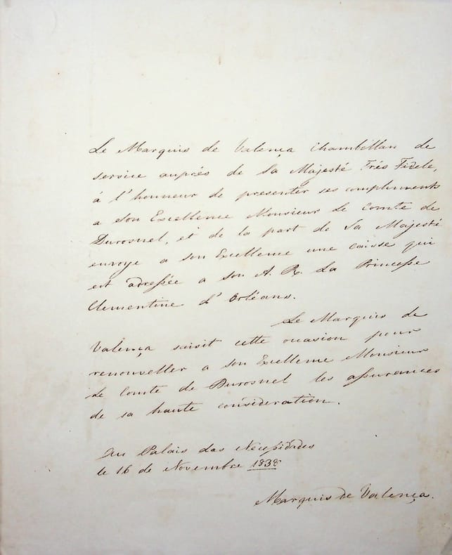 [Portugal] José Bernardino de Portugal e Castro (1780-1840), gentilhomme de la Chambre royale du Portugal, Chambellan du Roi, ministre de la guerre, éphémère président du conseil des ministre (une journée seulement !). L.A.S., Au Palais Das Necessidades, 16 novembre 1838, 1p in-4. « Le Marquis de Valença Chambellan de service auprès de Sa Majesté Très Fidèle a l'honneur de présenter ses compliments à Son Excellence Monsieur Le Comte de Durosnel, et de la part de Sa Majesté envoie à son Excellence une caisse qui est adressée à son A.R. La Princesse Clémentine d'Orléans. Le Marquis de Valença saisit cette occasion pour renouveller à son Excellence Monsieur le Comte de Durosnel les assurances de sa haute considération. Marquis de Valença ». [419]
