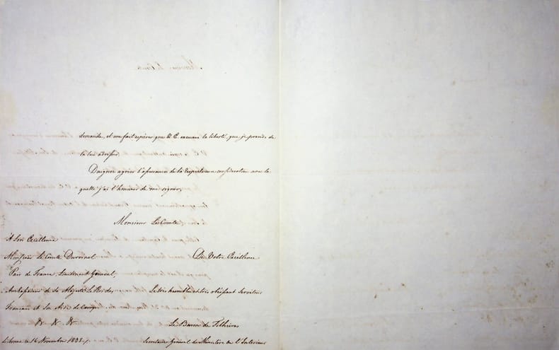 [Portugal] José Balbino Barbosa de Araùjo (1787-1848), 1er baron de Telheiras, secrétaire général du Ministère de l'Intérieur. L.A.S., Lisbonne, 16 novembre 1838, 2p in-4. Belle lettre amicale à laquelle était jointe la copie authentique de l'acte de baptême de l'infant Louis, futur roi du Portugal, des décorations pour son ami. Il lui recommande sa femme et sa fille qui habitent Paris. Belle lettre. [419]