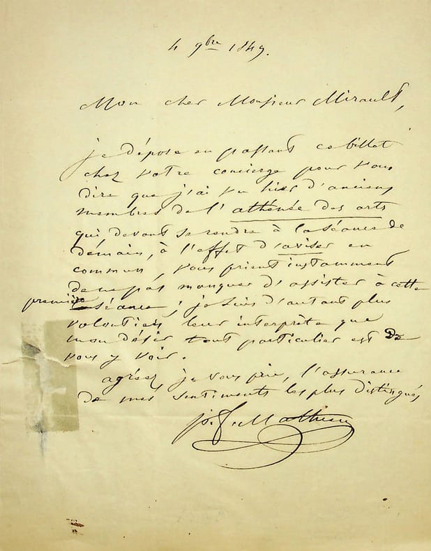 Pierre-François Mathieu (1808-1864), écrivain, auteur d'ouvrages sur les convulsionnaires, président de l'Athénée des Arts. L.A.S., 4 novembre 1849, 1p in-4. Au peintre Claude-François Mirault (1784-1862), membre de l'Athénée des Arts. Il lui demande d'être présent à la première séance du lendemain car d'anciens membres vont revenir. Déchirure grossièrement réparée avec un scotch au dos. Peu commun. [419]