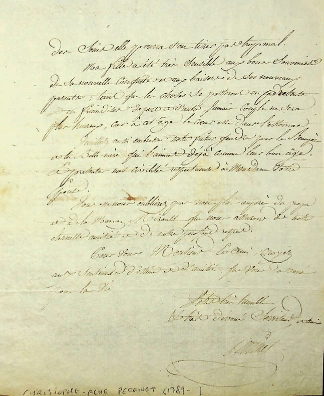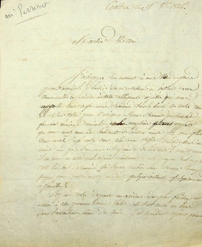Christophe-René Perrinet (1789-1880), médecin. L.A.S., Couture-sur-Loir, 25 octobre 1826, 2p in-4. Au peintre Claude-François Mirault (1784-1862), membre de l'Athénée des Arts. Longue lettre amicale. Quelques lettres manquantes en bordure. [419]