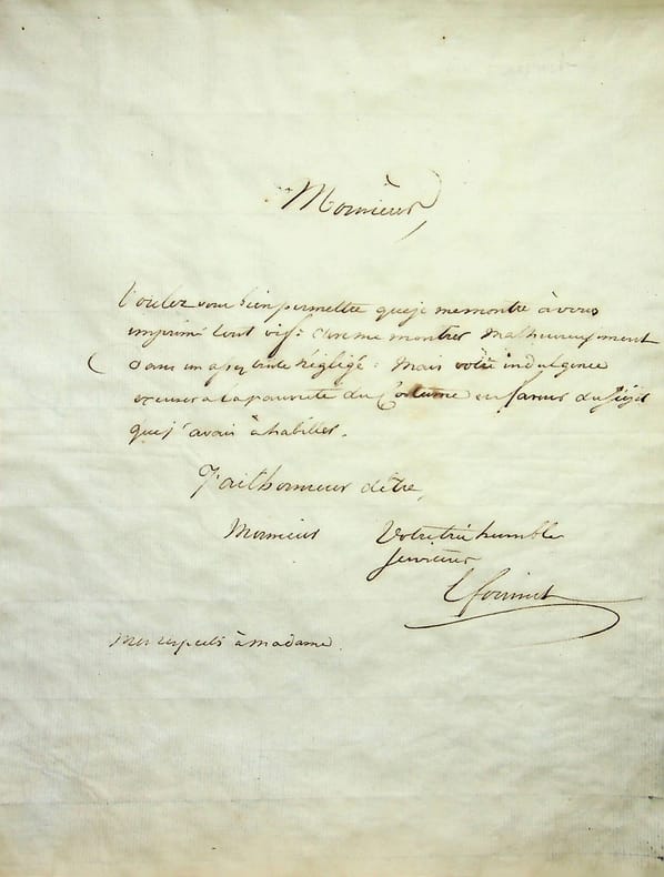 Ernest Fouinet (1799-1845), poète, romancier, écrivain de contes pour la jeunesse. L.A.S., sd, 1p in-4. Au peintre Claude-François Mirault (1784-1862), membre de l'Athénée des Arts. Lettre amicale lors de l'envoi d'un livre : « Monsieur, Voulez-vous bien permettre que je me montre à vous imprimé tout vif : c'est me montrer malheureusement dans un assez triste négligé. Mais votre indulgence excusera la pauvreté du costume en faveur du sujet que j'avais à habiller. EFouinet ». Papier un peu gondolé. Peu commun. [419]