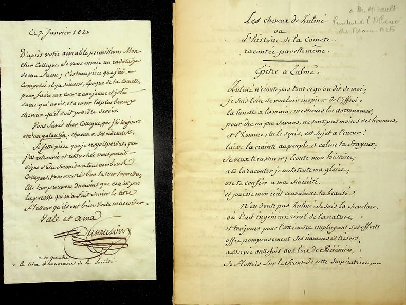 François-Jean Dusausoir (1737-1822), poète, écrivain, franc-maçon. L.A.S. & Poème autographe signé, 7 janvier 1821, 1p in-8 & 7p in-4. Au peintre Claude-François Mirault (1784-1862), membre de l'Athénée des Arts. Il envoie un « radotage de [sa] façon » écrit 10 ans plus tôt. Cette pièce fut écrit à l'occasion du passage de la « Grande comète de 1811 » et est titrée « Les cheveux de Zulmé ou l'histoire de la comète racontée par elle-même ». Beau document, peu commun. [419]
