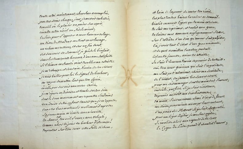 C'est avec plaisir qu'elle copie pour lui un de ses poèmes - Sa lettre lui est parvenue avec retard - Elle demande de lui pardonner d'avoir oublié son visage - "La vie est si fuyante et si chargée" - Il lui donne du courage - Elle a choisi le poème au hasard - [Sur la seconde feuille] - Beau poème élégamment manuscrit "Les Virtuoses": "Approches toi du cygne si tu oses" ...-
