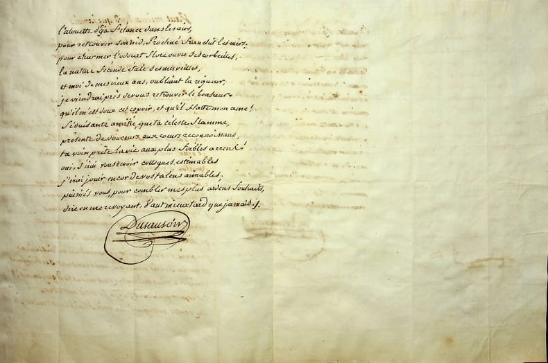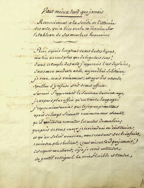 François-Jean Dusausoir (1737-1822), poète, écrivain, franc-maçon. Poème autographe signé, sd (probablement 1821), 2p in-4. Au peintre Claude-François Mirault (1784-1862), membre de l'Athénée des Arts. Joli poème titré « Vaut mieux tard que jamais », sous-titré « Remerciement à la Société de l'Athénée des Arts qui a bien voulu m'inscrit sur le tableau de ses membres honoraires ». Beau document, peu commun. [419]