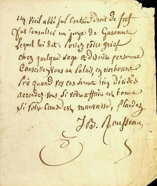 Jean-Baptiste Rousseau (1670-1741), poète, écrivain. Copie ancienne d'un poème, ca. 1750, 1p in-12. Copie, peut-être du vivant du poète mais pas de sa main d'un petit poème de 8 vers, une épigramme commençant par « un vieil abbé sur certain droit de fief ». [419]