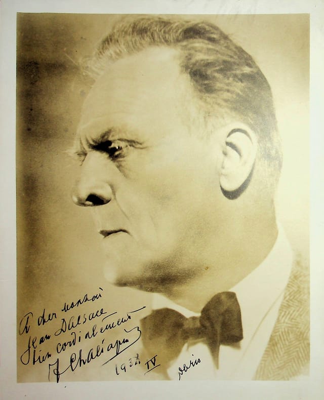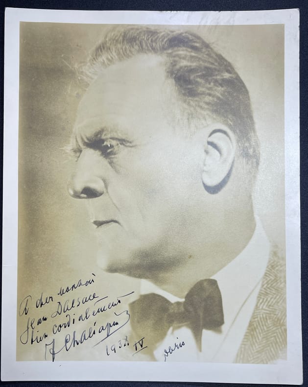 Fédor Chaliapine Chaliapin (1873-1938), acteur russe, chanteur d'opéra, basse. Photographie originale dédicacée, avril 1938, 254*202mm environ. Superbe portrait photographique du grand acteur russe avec une dédicace datée d'avril 1938 à son médecin Jean Dalsace (1893-1970) : « A cher Monsieur Jean Dalsace, bien cordialement. F Chalipine. 1938 IV. Paris ». Ce portrait photographique est l'un de ceux qu'il dédicaça régulièrement à la fin de sa vie. Probablement la dernière dédicace du grand acteur russe qui meurt à Paris d'une leucémie le 12 avril 1938. [420]