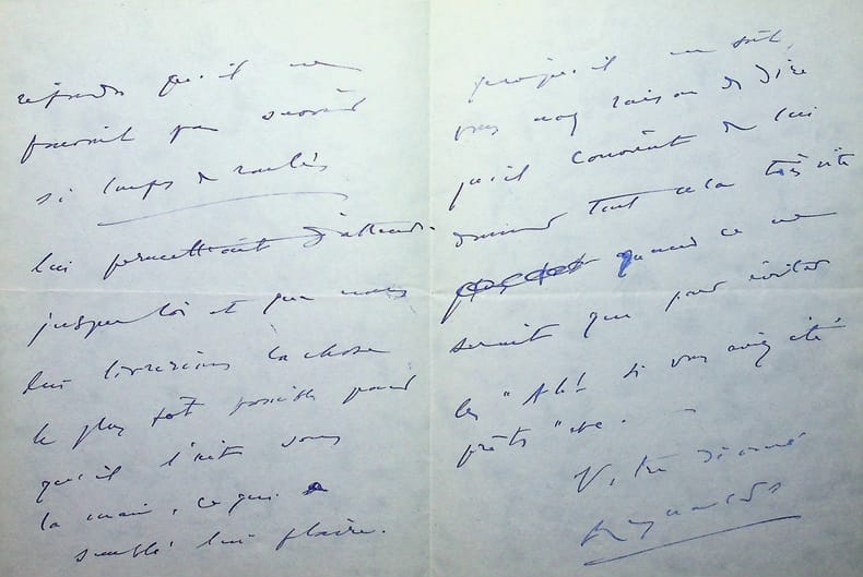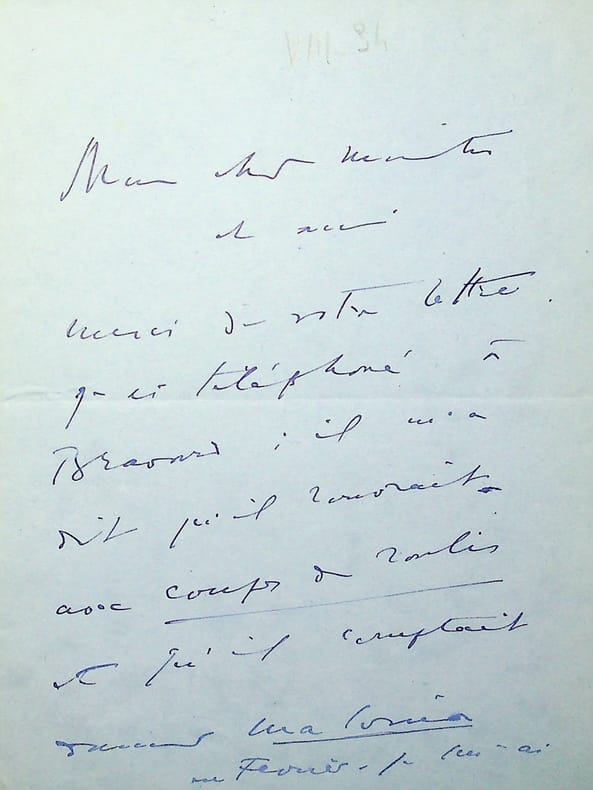 Reynaldo Hahn (1874-1947), compositeur, chef d'orchestre, compagnon de Marcel Proust. L.A.S., sd [août 1934], 3p in-8. « Mon cher maître et ami, Merci de votre lettre. J'ai téléphoné à Bravard : il m'a dit qu'il rouvrait avec Coups de roulis [Opérette d'André Messager] et qu'il comptait donner Malvina en février. Je lui ai répondu qu'il ne pouvait pas savoir si coups de roulis lui permettaient d'attendre jusque là et que nous lui livrerions la chose le plus tôt possible pour qu'il l'ait sous la main, ce qui a semblé lui plaire. Quoiqu'il en soit, vous avez raison de dire qu'il convient de lui donner tout cela très vite quand ce ne serait que pour éviter les "Ah ! Si vous aviez été prêts" etc. Votre dévoué Reynaldo ». Georges Bravard (1883-1952) était en effet directeur du théâtre de la Gaîté-Lyrique de 1919 à 1936, d'abord avec Gabriel Trarieux puis seul à partir de 1926. Il fit donc jouer l'opérette de Messager, à partir du 30 octobre 1934, et Malvina y fut bien créée, mais un peu plus tard que prévu, le 23 mars 1935. Belle lettre. [420]