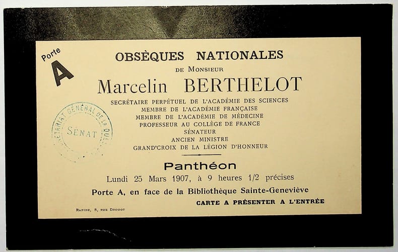 Marcellin Berthelot (1827-1907), chimiste, biologiste, homme politique, membre de l'Académie française. Carton permettant l'entrée à ses obsèques nationales le 25 mars 1907, avec un cachet « secrétariat général de la questure - Sénat ». [420]