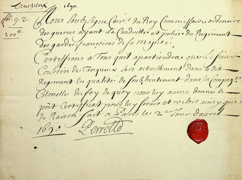 [Militaria] Robert Perelle (fin XVIIe-début XVIIIe), commissaire général des gardes françaises, commissaire ordinaire des guerres. P.S., 2 avril 1690, 1p in-8. Certificat de bons services pour le sieur Coutin de Tanqueux, sous-lieutenant de la compagnie Colonelle du régiment des gardes françoises. Beau cachet de cire armorié. Beau document. [420]
