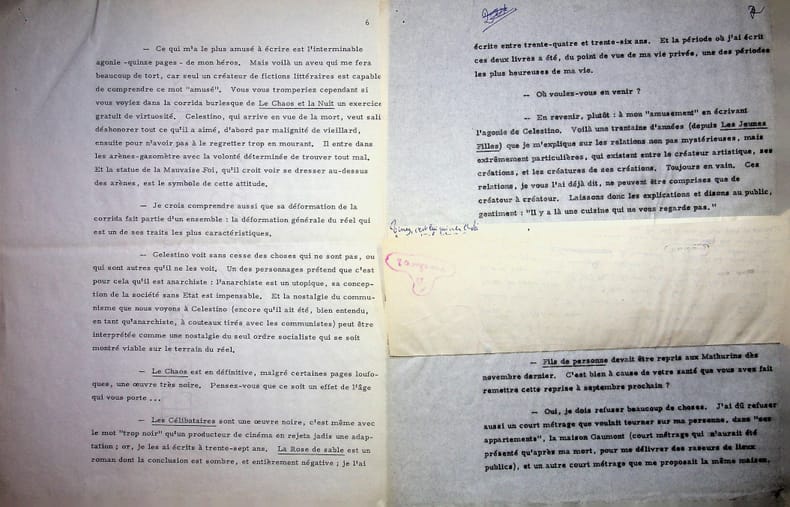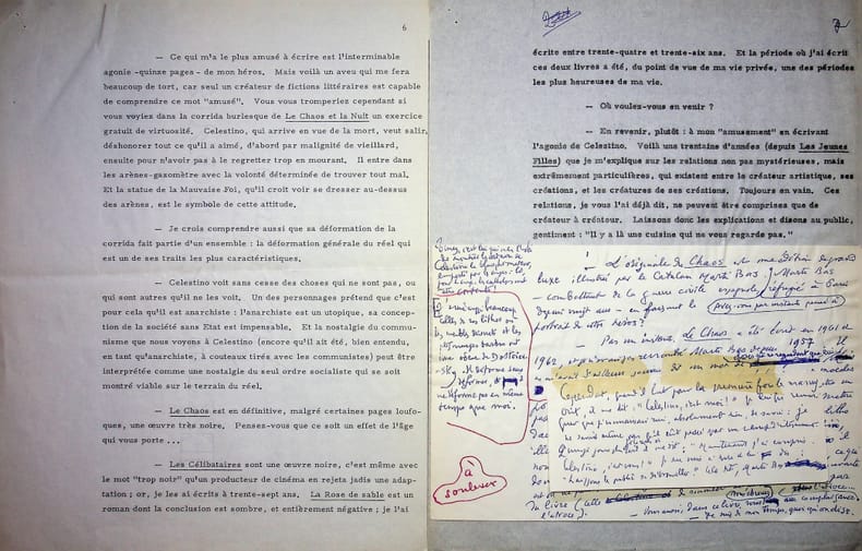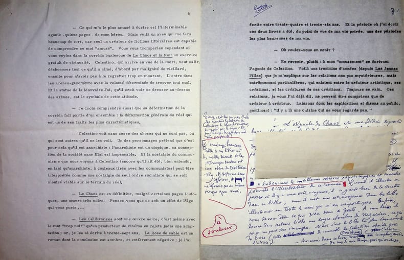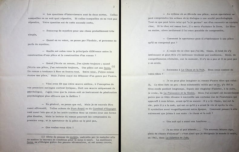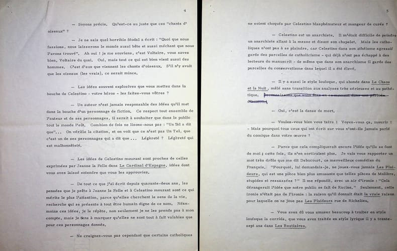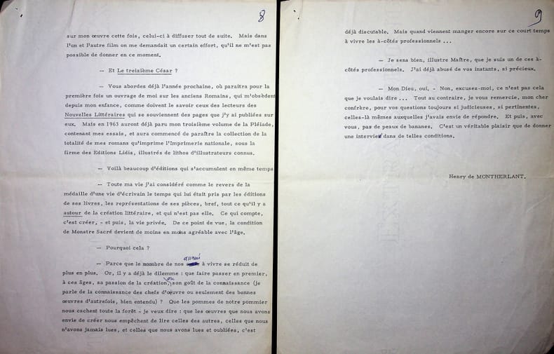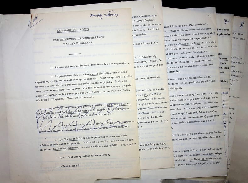 Henry de Montherlant (1895-1972), écrivain, membre de l'Académie française. Document tapuscrit avec corrections autographes et passage autographe, 1963, 9p in-4. Bel article sur la parution de son roman Le Chaos et la Nuit, publié dans Les Nouvelles Littéraires n°1856 du 28 mars 1963. Rare. [420]