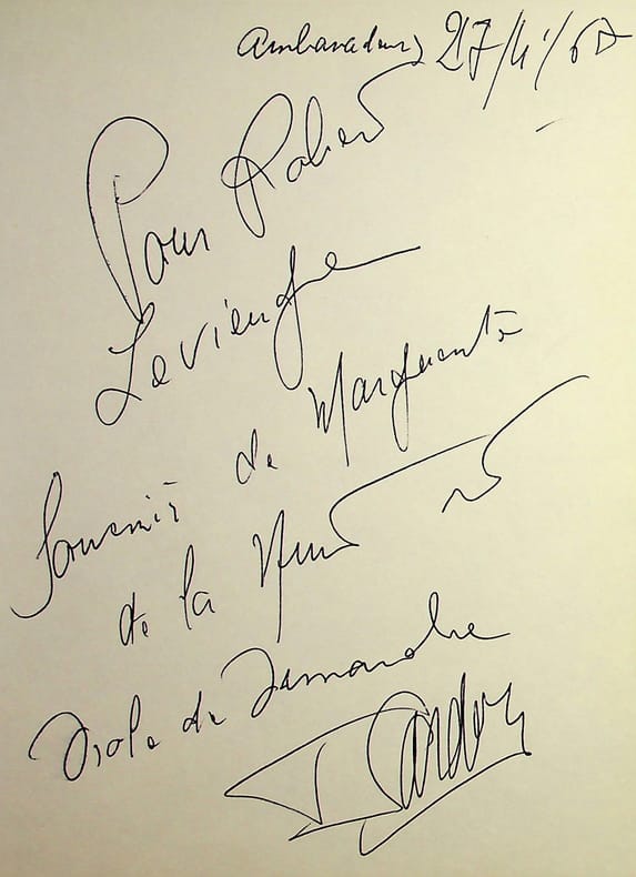 Fernand Sardou (1910-1976), chanteur, acteur. P.A.S., 27 avril 1967, 1p in-8. Extrait d'un album, « en souvenir de Marguerite de la nuit et Drôle de dimanche », deux films dans lesquels il a joué. [421]