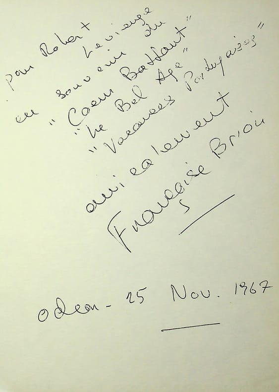Françoise Brion (1933-2025), actrice. P.A.S., 25 novembre 1967, 1p in-8. Extrait d'un album, « en souvenir du Coeur battant, Le bel âge, Vacances portugaises », films dans lesquels elle a joué. [421]