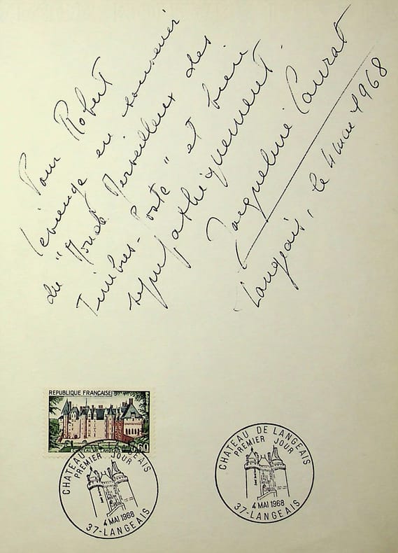 Jacqueline Caurat (1927-2021), présentatrice, animatrice de télévision, journaliste. P.A.S., 4 mai 1968, 1p in-8. Extrait d'un album, « en souvenir du monde merveilleux des timbres », ouvrage qu'elle a publié. Timbre du château de Langeais avec cachet premier jour. [421]
