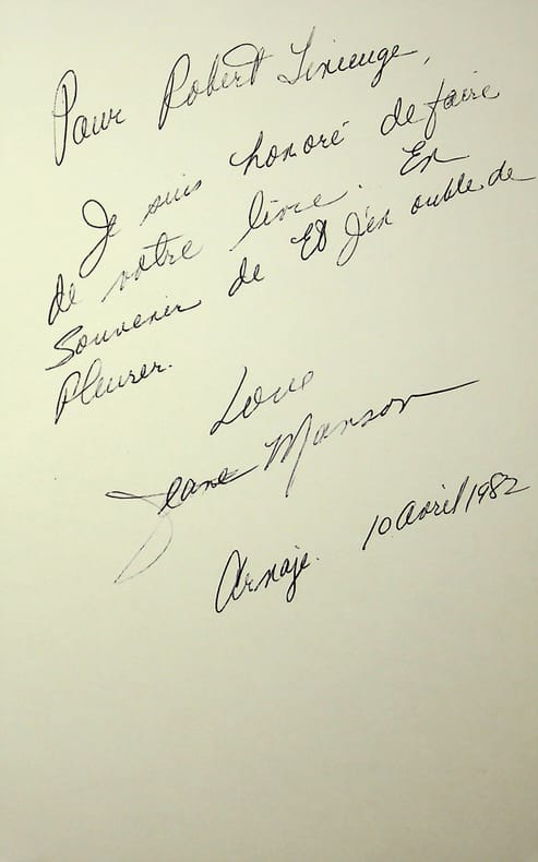 Jeane Manson (1950-), chanteuse, actrice américaine. P.A.S., 10 avril 1982, 1p in-8. Extrait d'un album, « en souvenir de Et j'en oublie de pleurer », une de ses chansons, en français. [422]