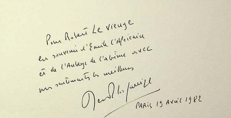 Bernard Lajarrige (1912-1999), comédien. P.A.S., 19 avril 1982, 1p in-12. Extrait d'un album, « en souvenir d'Emile l'africain et de l'Auberge de l'abîme », films dans lesquels il a joué. [422]