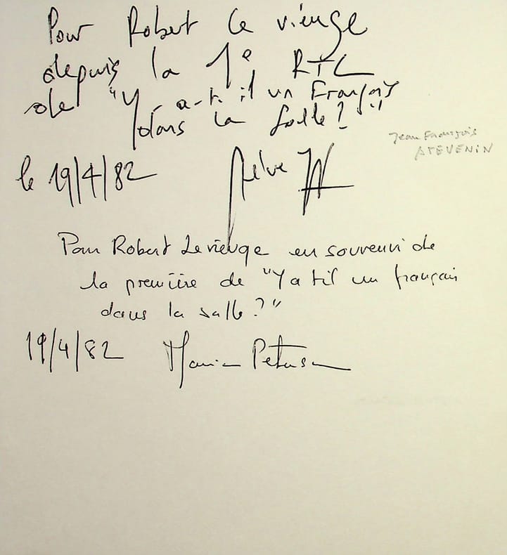 Jean-François Stevenin (1944-2021), acteur, réalisateur ; Marion Peterson (1955-), actrice franco-américaine. P.A.S. par les deux, 19 avril 1982, 1p in-8. Extrait d'un album, « en souvenir de la première de Y a-t-il un français dans la salle », chacun des deux acteurs ayant mis à peu près la même phrase. Ils ont tous les deux joué dans ce film. [422]