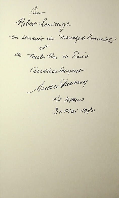 André Dassary (1912-1987), chanteur d'opérette. P.A.S., 30 mai 1980, 1p in-8. Extrait d'un album, « en souvenir du Mariage de Ramuntcho et du Tourbillon de Paris ». [422]