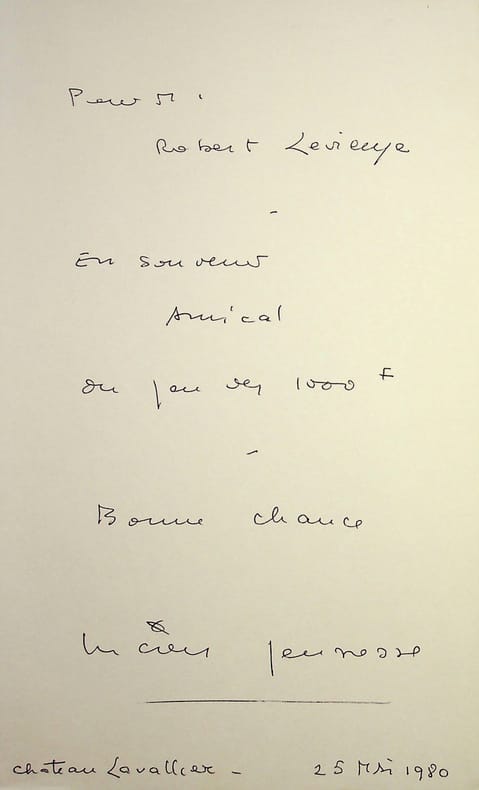 Lucien Jeunesse (1918-2008), acteur, chanteur, animateur de radio. P.A.S., 25 mai 1980, 1p in-8. Extrait d'un album, « en souvenir amical du jeu des 1000 francs ». [422]
