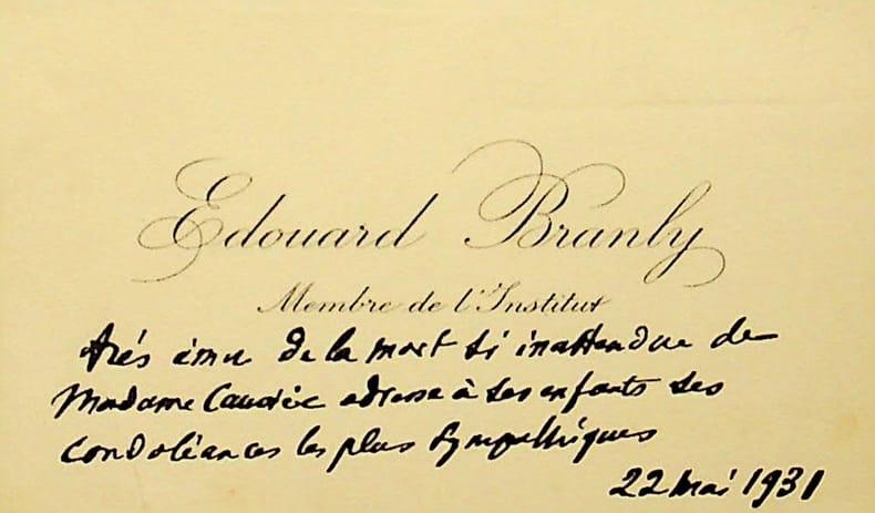 Edouard Branly (1844-1940), physicien, médecin. C.A., 22 mai 1931, 3 lignes. « Très ému de la mort si inattendue de madame Cau. adresse à ses enfants ses condoléances les plus sympathiques ». [423]