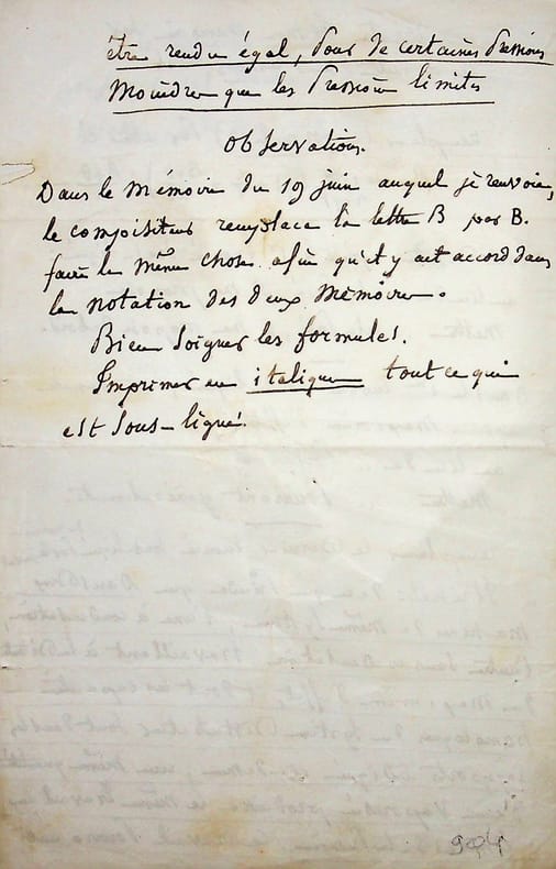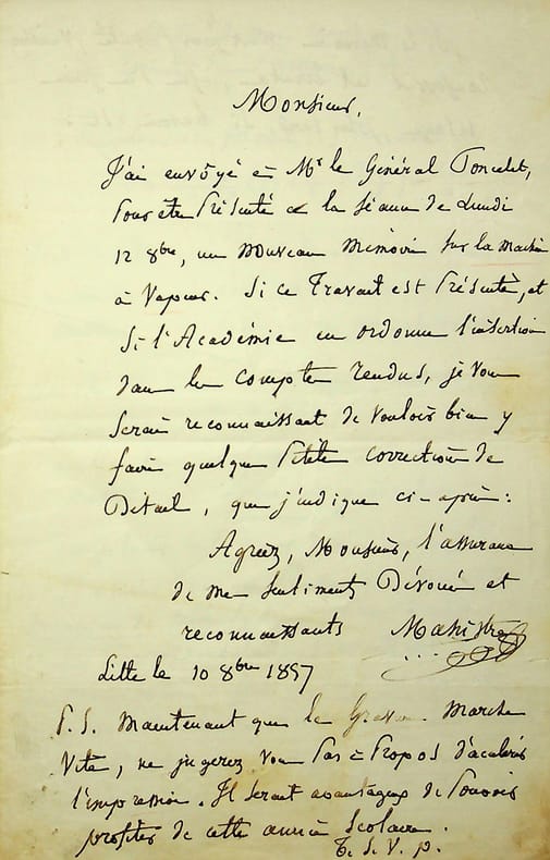 Alcippe Mahistre (1811-1860), mathématicien, mécanicien, spécialiste des machines à vapeur, professeur à Lille. L.A.S., Lille, 10 octobre 1857, 3p in-8. Très longue lettre annonçant l'envoi d'un mémoire sur la machine à vapeur envoyé au général Jean-Victor Poncelet (1788-1867), mathématicien et ingénieur. Il demande à son correspondant d'y apporter des corrections si le mémoire était inscrit dans les comptes-rendus de l'Académie des sciences. La seconde partie de la lettre est le long errata. Beau document. [423]