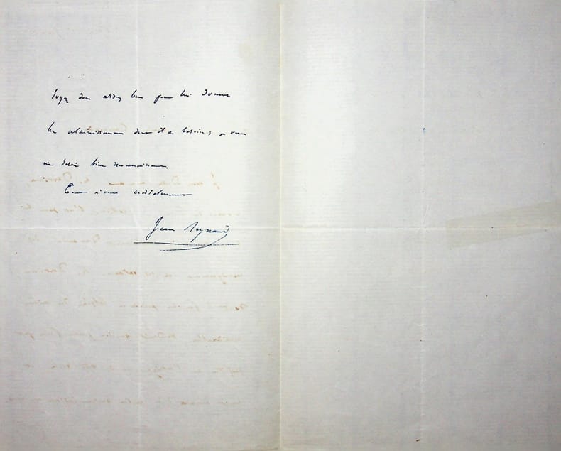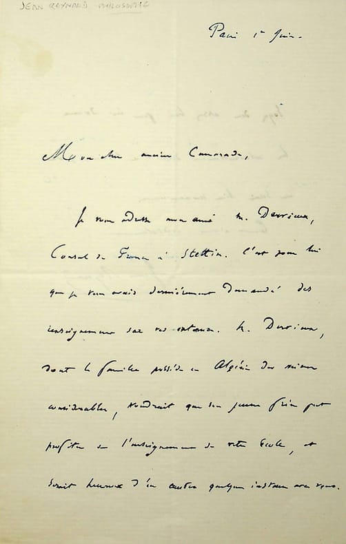 Jean Reynaud (1806-1863), philosophe, homme politique. L.A.S., Paris, 1er juin, 1p 1/2 in-8. « Mon cher ancien camarade, Je vous adresse mon ami M. Dervieux, consul de France à Stettin [Szczecin, Pologne]. C'est pour lui que je vous avais dernièrement demandé des renseignements sur vos instances. M. Dervieux, dont la famille possède en Algérie des bien considérables, voudrait que son jeune frère put profiter de l'enseignement de votre école, et serait heureux d'en [mot illisible] quelque instance avec vous. Soyez donc assez bon pour lui donner les [mot illisible] dont il a besoin. Je vous en serai bien reconnaissant. Tout à vous cordialement. Jean Reynaud ». [423]