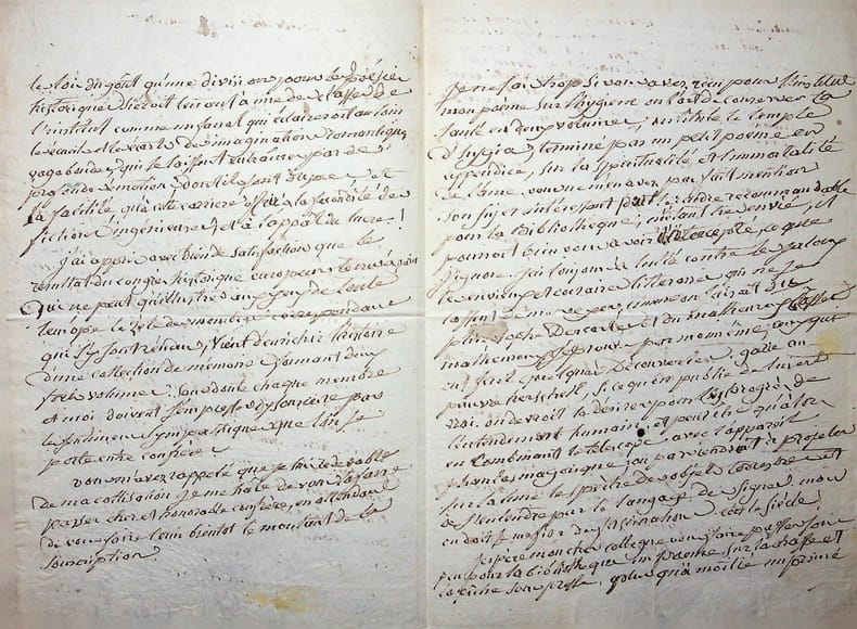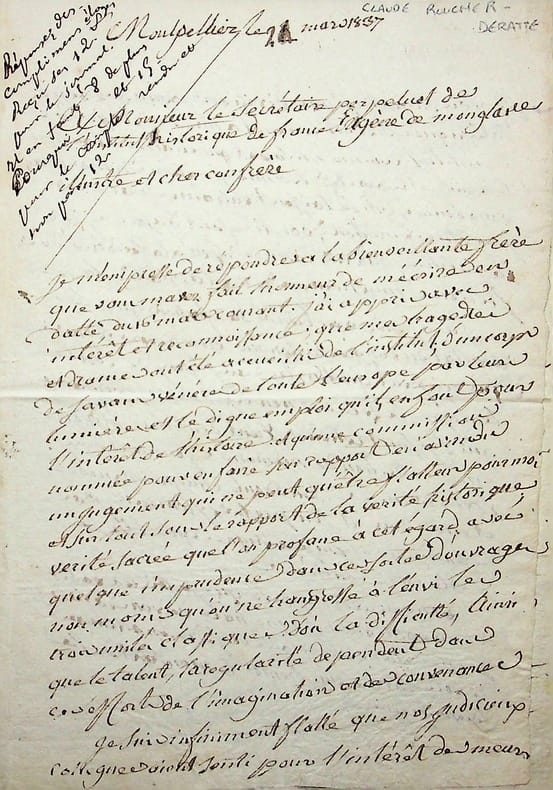 Claude Roucher-Deratte (1761-1840), médecin, poète, chimiste, physicien, professeur de physique. L.A.S., Montpellier, 24 mars 1837, 4p in-4. A Eugène de Monglave (1796-1878) en tant que secrétaire perpétuel de l'Institut historique de France (qu'il a fondé). Très longue lettre à propos de ses ouvrages qu'il a envoyés pour la bibliothèque de l'Institut : tragédies, poésies historiques etc. Il parle notamment des « imaginations romantiques vagabondes », de littérature, de Descartes, etc. Peu commun. [423]