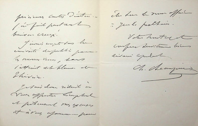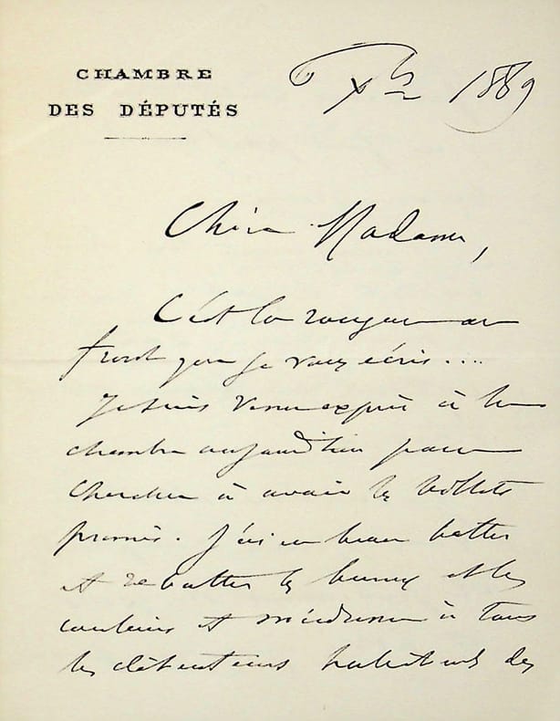 Charles Beauquier (1833-1916), homme politique, historien. L.A.S., 6 décembre 1889, 2p 1/2 in-12. A une dame, s'excusant de ne pas avoir réussi à obtenir un billet d'entrée à la chambre malgré ses démarches. [423]