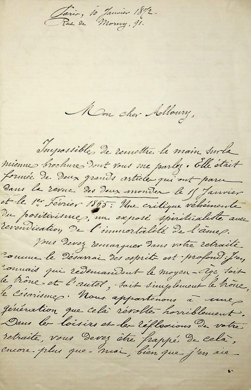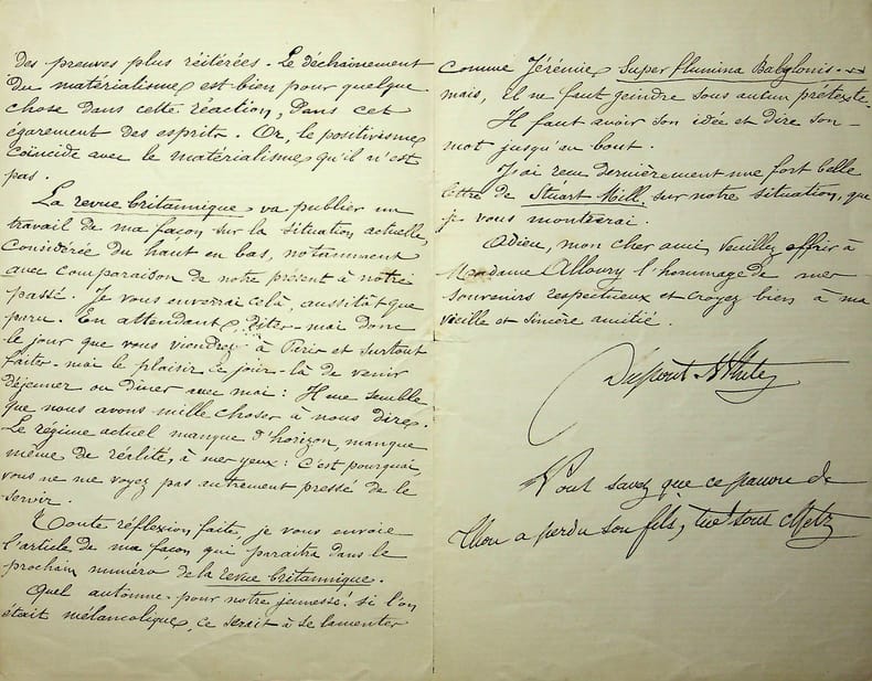 Charles Brook Dupont-White (1807-1878), avocat, économiste, socialiste. L.S. (avec 2 lignes autographes), Paris, 19 janvier 1872, 3p in-8. Au journaliste Louis Alloury (1805-1884). Lettre amicale dans laquelle il déplore notamment ne pas retrouver une brochure réussissant deux articles critiquant de manière véhémente le positivisme. Il mentionne un article à venir dans La Revue britannique sur la situation actuelle. Cet article a bien été publié et concernant en fait la recherche d'une constitution pour la France qui n'en eut pas de 1871 à 1875. Le titre de cet article était « Ce qui pourrait tenir lieu d'une constitution ». [423]