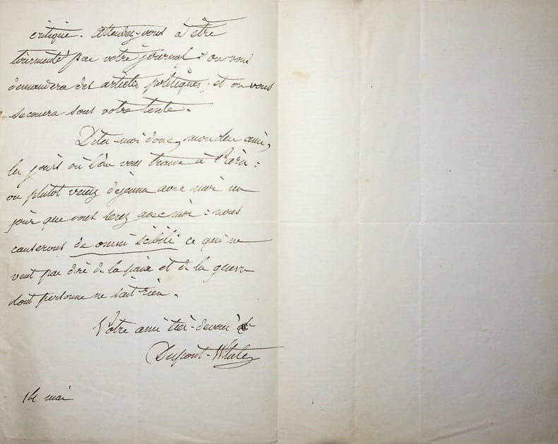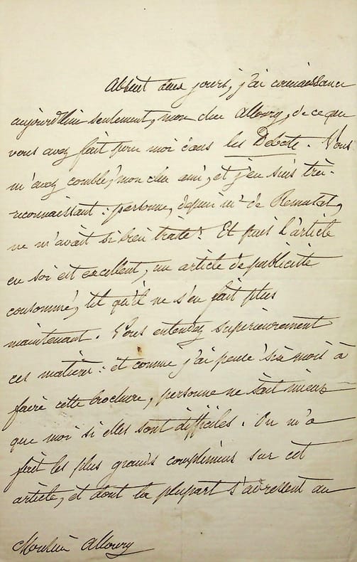 André Dupin dit Dupin aîné (1783-1865), avocat, magistrat, homme politique. L.A.S., 7 octobre, 4p in-8. Au journaliste Louis Alloury (1805-1884). Longue lettre difficile à déchiffrer. [423]