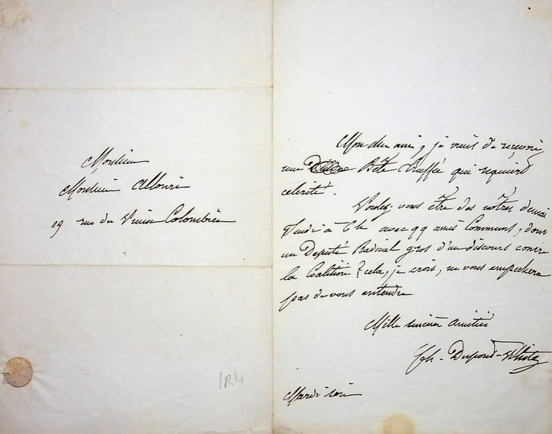 Charles Brook Dupont-White (1807-1878), avocat, économiste, socialiste. L.A.S., sd [mardi soir], 1p in-8. Au journaliste Louis Alloury (1805-1884). « Mon cher ami, je viens de recevoir une bête truffée qui requiert célérité. Voulez-vous être des nôtres demain jeudi à 6h avec qq amis communs dont un député radical gros d'un discours contre la coalition ? Cela, je crois, ne vous empêchera pas de vous entendre. Mille sincères amitiés. Ch. Dupont-White ». [423]