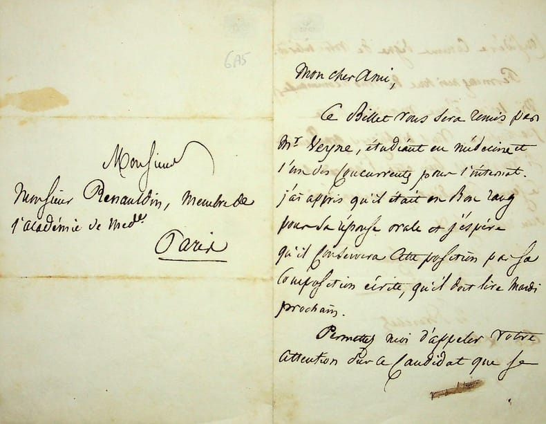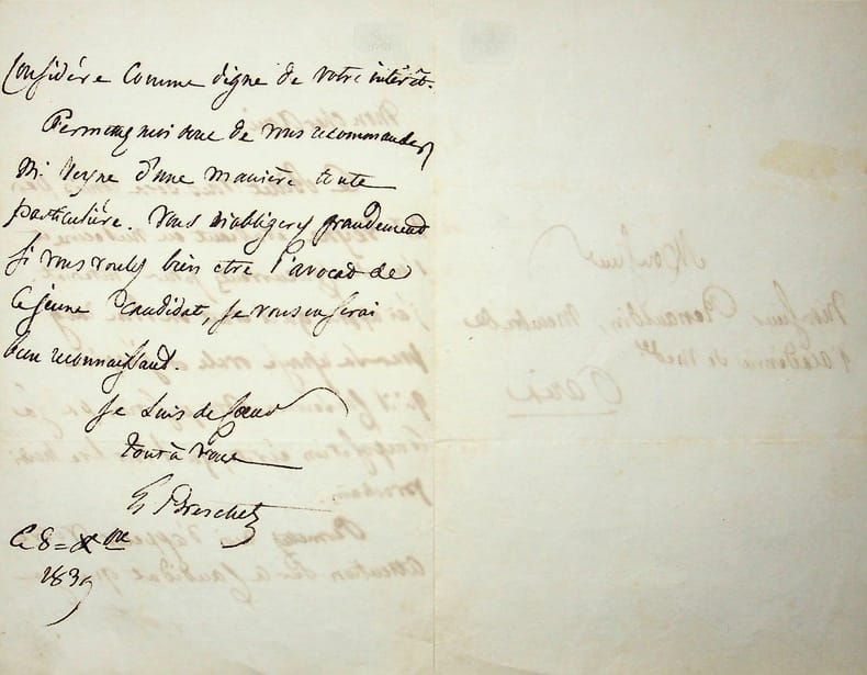 Gilbert Breschet (1784-1845), médecin, anatomiste, originaire de Clermont-Ferrand. L.A.S., 8 décembre 1839, 2p in-8. Au médecin Léopold-Joseph Renauldin (1775-1859), membre de l'Académie de Médecine dont il sera président en 1837 pour lui recommander le jeune François-Auguste Veyne (1812 ou 1815-1875) : « Mon cher ami, Ce billet vous sera remis par Mr Verne, étudiant en médecine et l'un des concurrents pour l'internat. J'ai appris qu'il était en bon rang pour sa réponse orale et j'espère qu'il conservera cette position par la composition écrite, qu'il doit lire mardi prochain. Permettez-moi d'appeler votre attention sur ce candidat que je considère comme digne de votre intérêt. Permettez-moi donc de vous recommander M. Veyne d'une manière toute particulière. Vous m'obligeriez grandement si vous voulez bien être l'avocat de ce jeune candidat, je vous en serai bien reconnaissant. Je suis de coeur, tout à vous, G Breschet ». Veyne sera bien reçu à l'internat en 1839 et docteur en médecine en 1844. Il sera ami de nombreuses personnalités comme Raspail, Gavarni, Desbordes-Valmore ou Sainte-Beuve, ce dernier étant un ami de jeunesse. Belle lettre de recommandation. [424]