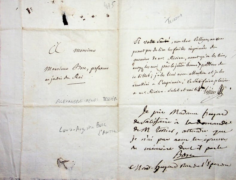 Henri-Alexandre Tessier (1741-1837), médecin, agronome ; Louis Augustin Bosc d'Antic (1759-1828), naturaliste. L.A.S. de Tessier, avec L.A.S. de Bosc d'Antic sur le même feuillet, sd [1826?], 1p in-8. Lettre de Tessier au naturaliste Bosc d'Antic : « Si votre santé, mon cher Collègue, ne vous permet pas de lire les feuilles imprimées du mémoire de Mr Rivière, avant qu'on les tire, envoyez-les moi par le jeune homme, porteur de ce billet ; je les lirai avec attention et je les remettrai à l'imprimerie. Ce sera faire plaisir à Mr Rivière. Salut et amitié. Tessier ». Sous cette lettre, Bosc d'Antic écrit à Rosalie Huzard (1767-1849), imprimeuse et éditrice, épouse du fameux vétérinaire : « Je prie madame Huzard de satisfaire à la demande de M. Tessier, attendu que je n'ai pas reçu les épreuves du mémoire dont il parle. Bosc. Madame Huzard rue de l'Eperon ». Il s'agit probablement du baron Louis Ulfrein de Rivière (1789-1871), maire de Saint-Gilles (Gard) qui publie chez Huzard un Mémoire sur la Camargue en 1826. Belle réunion de deux signatures intéressantes. [424]