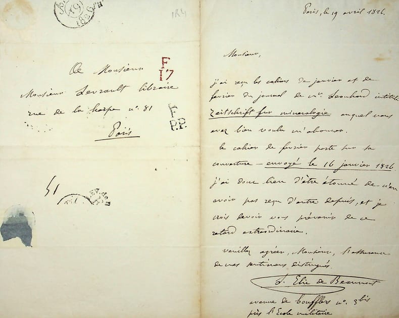 Léonce Elie de Beaumont (1798-1974), géologue, secrétaire perpétuel de l'Académie des Sciences. L.A.S., Paris, 19 avril 1826, 1p in-8. Au libraire Levrault, à Paris : « Monsieur, J'ai reçu les cahiers de janvier et de février du journal de Mr Leonhard intitulé Zeitschrift fur mineralogie auquel vous avez bien voulu m'abonner. Le cahier de février porte sur sa couverture - envoyé le 16 janvier 1826. J'ai donc bien lieu d'être étonné de n'en avoir pas reçu d'autre depuis, et je crois devoir vous prévenir de ce retard extraordinaire. Veuillez agréer, Monsieur, l'assurance de mes sentimens distingués. L. Elie de Beaumont. Avenue de Boufflers n°3bis près l'Ecole militaire ». Kart Cäsar von Leonhard (1779-1862) est un minéralogiste allemand. [424]