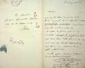 [ 3 L.A.S. adressées à Mlle Simone Arnaud Delage ] Lettre autographe signée de Camille Doucet, de l'Académie Française, 1 page à en-tête de l'Institut de France sous enveloppe marquée "Académie Française", datée du 25 mai 1885 : "Mademoiselle et chère confrère, Rien de plus touchant et de plus dramatique que votre Roche "Mengan", j'en suis encore tout ému & je m'empresse de joindre mes très sincères compliments aux remerciements que je vous dois pour votre bon et gracieux souvenir" ; Lettre autographe signée de Georges Monval, Bibliothécaire Archiviste de la Comédie Française, datée du 12 février 1883, 1 page sous enveloppe : "Mademoiselle, J'ai l'honneur de vous informer que, dans sa séance du 8 février, le Comité d'Administration du Théâtre Français a pris connaissance du rapport fait par la Commission d'examen sur votre comédie : "Mademoiselle du Vigean". J'ai en même temps le plaisir de vous annoncer que le Comité, s'associant aux conclusions de ce rapport, a réservé votre ouvrage pour l'envoyer devant le Comité de Lecture" ; Lettre autographe signée d'Albert Delpit, 4 pages sous enveloppe : "Mademoiselle, j'irai vous voir demain. [ ... ] Il est fort possible que je ne sois pas libre à 4 h ; mais plus tard. Et j'ai besoin de vous voir car j'ai des conseils importants à vous donner sur Jane Grey. Voulez-vous que nous admettions ceci ? Si vous ne receviez rien de moi, demain avant midi, c'est que j'irai rue St Pétersbourg [ ... ]