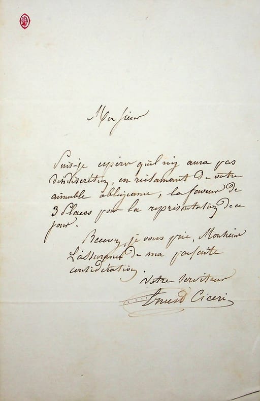 Ernest Ciceri (ca.1817-1866), peintre, lithographe français ayant travaillé aux Etats-Unis (Louisiane). L.A.S., sd, 1p in-8. « Monsieur, Puis-je espérer qu'il n'y aura pas d'indiscrétion, en réclamant de votre aimable obligeance, la faveur de 3 places pour la représentation de ce jour. Recevez, je vous prie, Monsieur, l'assurance de ma parfaite considération. Votre serviteur Ernest Ciceri ». Peu commun. [424]