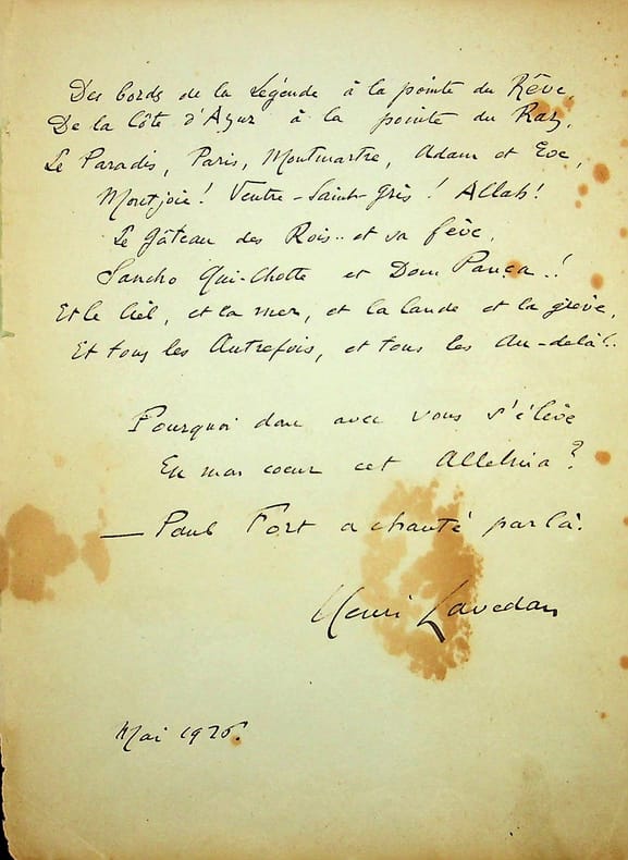 Henri Lavedan (1859-1940), écrivain, journaliste, membre de l'Académie française. Poème autographe signé, mai 1926, 1p in-4. A l'écrivain Paul Fort (1872-1960). Joli poème de 11 vers. [424]