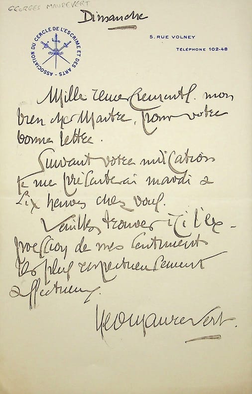 Georges Maurevert (1869-1964), écrivain, lauréat d'un prix de l'Académie Française. L.A.S., sd [dimanche], 1p in-8. Remerciements et confirmation d'un rendez-vous. Probablement adressée à l'écrivain Paul Hervieu. [424]