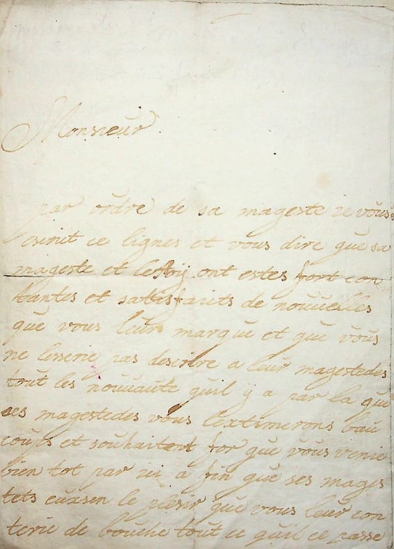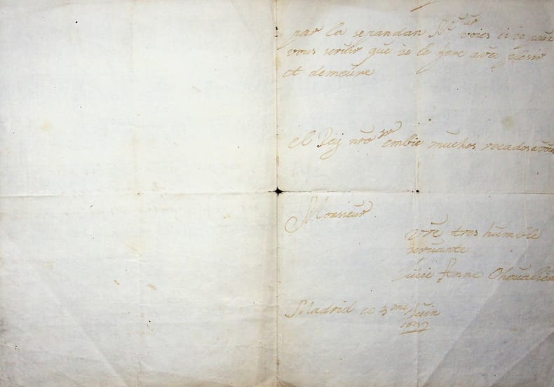 Anne Chevalier [proche du roi d'Espagne Charles II et de son épouse Mariana de Neoburgo - Marie-Anne de Neubourg]. L.A.S., Madrid, ce 3ème juin 1699, 2p in-4. [texte avec orthographe et grammaire aléatoires et corrigés ici] « Monsieur, Par ordre de sa majesté, je vous écrit ces lignes [pour] vous dire que sa majesté et le roi ont été fort contentes et satisfaites des nouvelles que vous leur marquez et que vous ne cesseriez pas d'écrire à leur majestés de toutes les nouveautés qu'il y a par la que ces majestés vous l'estimerons beaucoup et souhaitent fort que vous veniez bientôt par ici afin que ses majestés aient le plaisir que vous leur contiez de bouche tout ce qu'il se passe par là. Cependant, Monsieur, voyez si je peux vous servir, que je le ferai avec plaisir, et demeure, Monsieur, votre très humble servante [mot illisibe] Anne Chevalier ». On note, au milieu, la mention mélangeant français et espagnol : « el Rey nuestro Señor muchos recados à vous » (le roi vous envoie ses compliments). Sympathique lettre malheureusement non identifiée. [424]