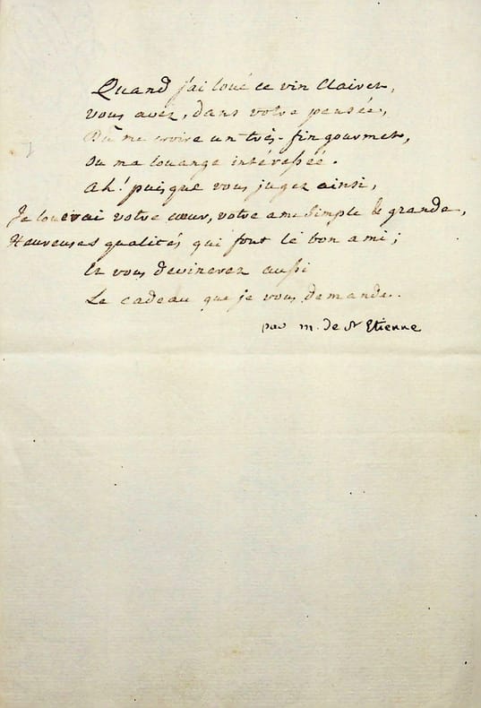 Jean-Paul Rabaut [de] Saint Etienne (1743-1793), pasteur, homme politique, président de la Convention Nationale, régicide. Poème autographe, sd, 1/2p in-8. Joli petit poème galant : « Quand j'ai loué ce vin clairet, Vous avez, dans votre pensée, Dû me croire un très fin gourmet, Ou ma louange intéressée Ah ! Puisque vous jugez ainsi, Je louerai votre coeur, votre âme simple de grande, Heureuses qualités qui font le bon ami ; Et vous devinerez aussi Le cadeau que je vous demande ». Une note indique « M. de Saint Etienne ». Rare poème de Rabaut-Saint-Etienne, autographe rare. [424]