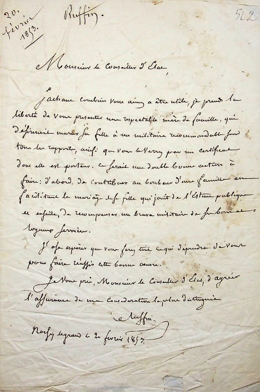 Jean-Baptiste Ruffin (XIXe), maire de Noisy-le-Grand de 1835 à 1853. L.A.S., 20 février 1853, 1p in-8. A un conseiller d'état, probablement Louis-Adolphe Leroy de Saint-Arnaud (1801-1873), conseiller d'état et sénateur, afin de lui présenter « une respectable mère de famille qui désirerait marier sa fille à un militaire recommandable ». [425]